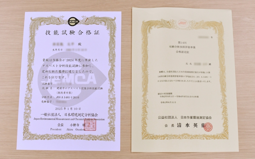 ・一般社団法人 日本環境測定分析協会 アスベスト分析技能試験(技術者対象)合格