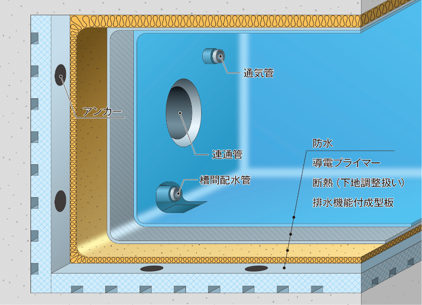 水深22mまで対応し、円筒型などの特殊形状の水槽にも対応できます。設計の要求に応じて断熱材の厚さが変更可能です。湧水対策のための排水機能付きの断熱仕様もあります。